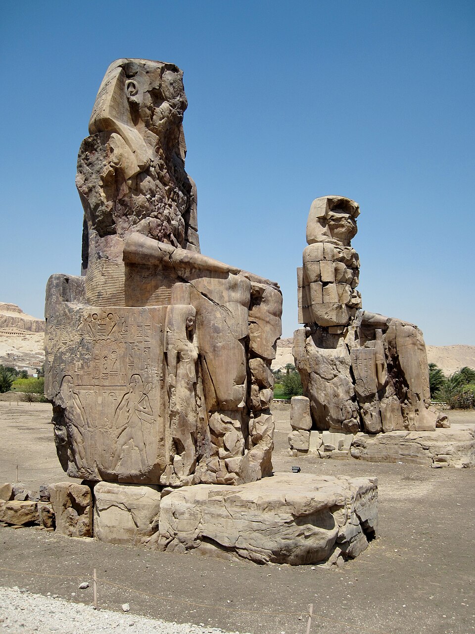 Colossi of Memnon: Two massive stone statues of Pharaoh Amenhotep III, standing guard at the entrance to his mortuary temple.